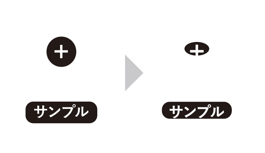 例えば「+」や「サンプル」という文字にアピアランスで囲みをつけている場合、そのままアウトライン化すると、下の画像のように囲み部分が変形してしまいます。