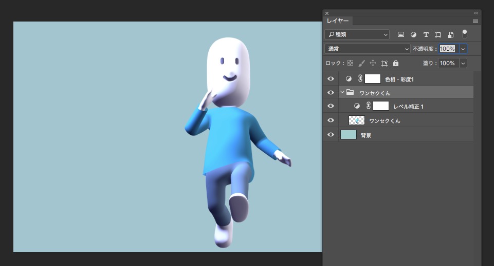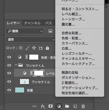レベル補正も本来はそれ以下のレイヤーに対して適用されるのですが、ワンセクくんフォルダ内に入っているため、「ワンセクくん」レイヤーに対してのみ適用されている状態です。