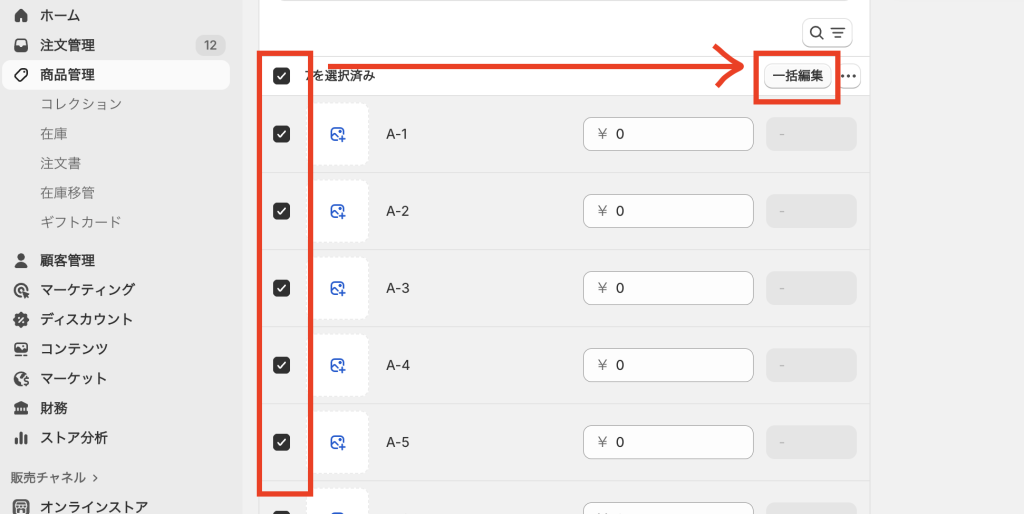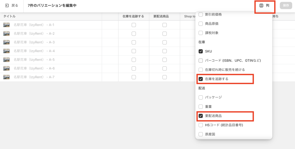 < 記事一覧 トップ 構築 Wiki shopify 【shopify】商品バリエーションの在庫、配送設定 【shopify】商品バリエーションの在庫、配送設定 投稿日2025年11月10日 更新日2025年11月10日 作成者嘉和知 ・商品の個別画面でバリエーションを全選択して、「一括編集」をクリック ・「列」のメニューから必要な項目にチェックを入れる。 ・配送、在庫設定が必要な商品バリエーションにチェックを入れる。