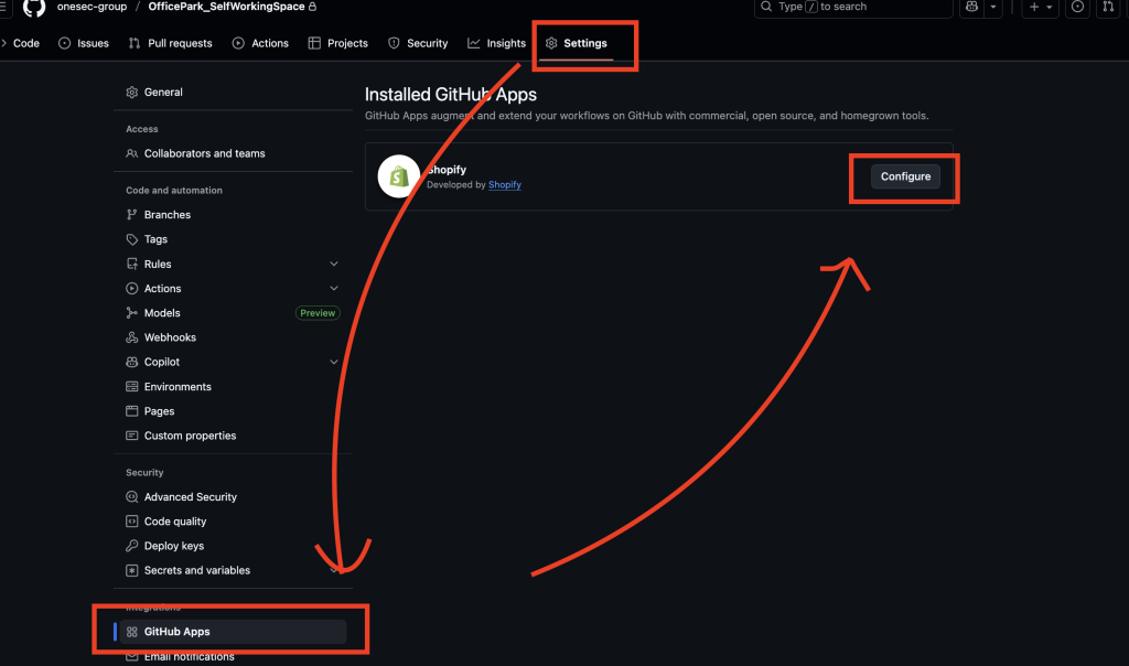 ・「settings」→「GitHub Apps」からshopifyのアプリの「configure」をクリック