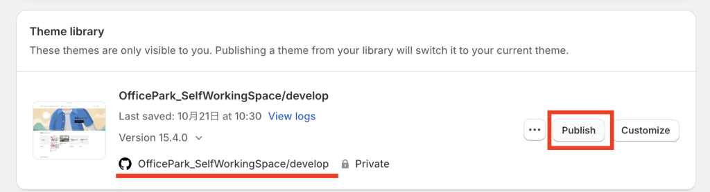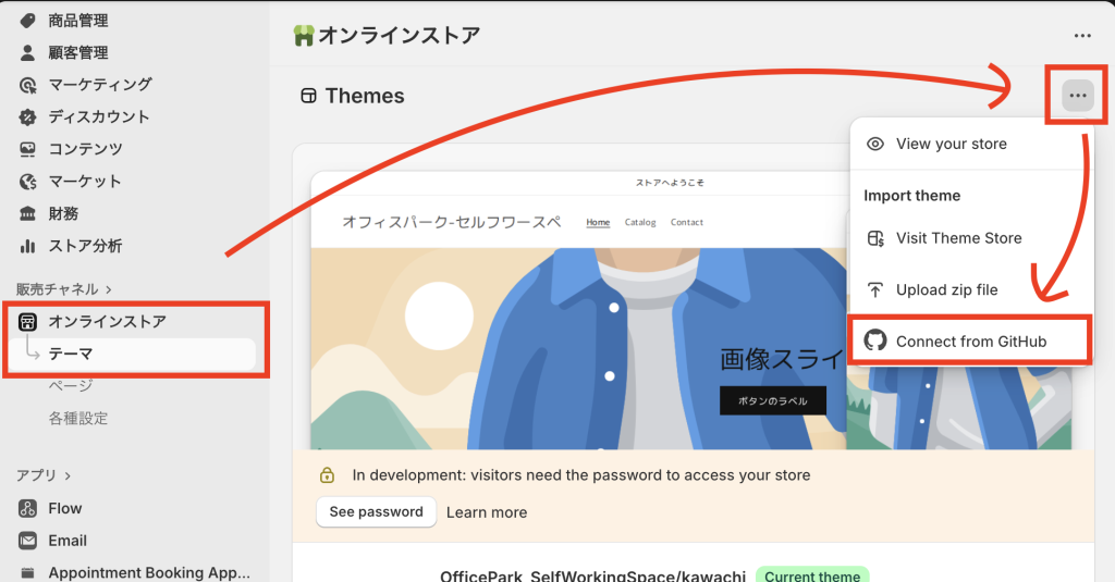 ・「オンラインストア」→「テーマ」のメニューから「Connect from GitHub」を選択