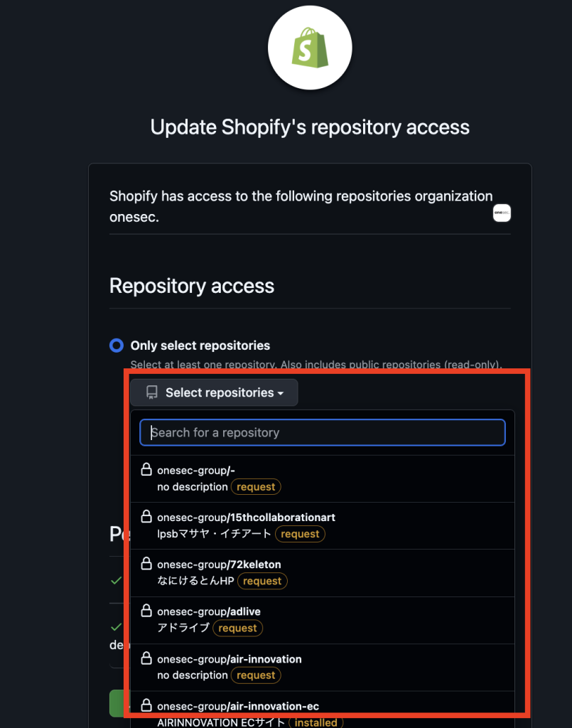・「Select Repositories」からshopifyに連携したいリポジトリを選択して、「update access」ボタンをクリックする。