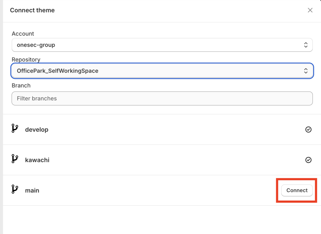 ・先ほど作成したリポジトリを選択して、連携するブランチの「connect」ボタンをクリック。