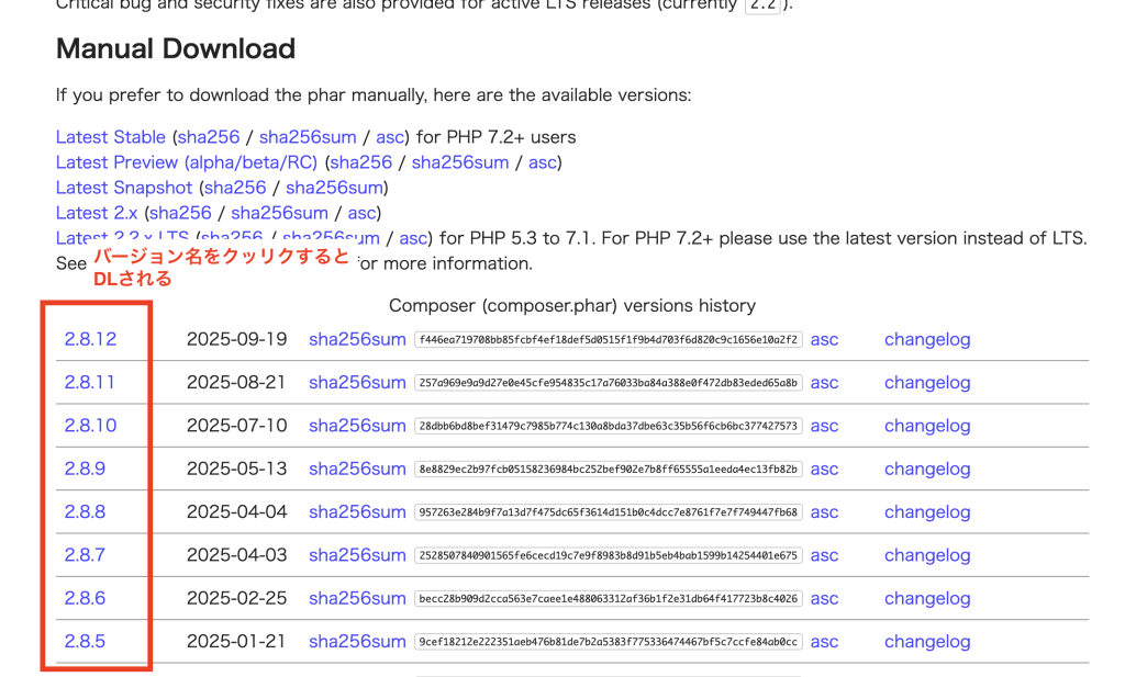 ・直接サイト(https://getcomposer.org/download/)からバージョンを指定してDLする。