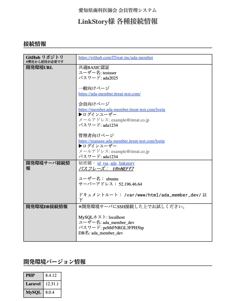 1.ITreatさんから共有された「各種接続情報・・・①」のファイルより、テストサイト情報を確認する。