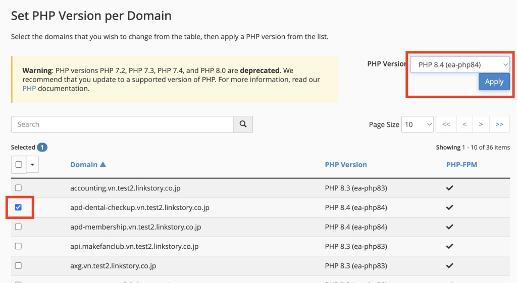 ・作成したドメインにチェックを入れ「PHP Version」を選択して「Apply」ボタンを押す。