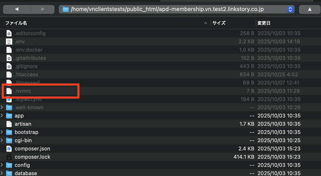 ・「.nvmrc」ファイルを作成しルートに配置。使用したいバージョンを「22.18.0」と記述。