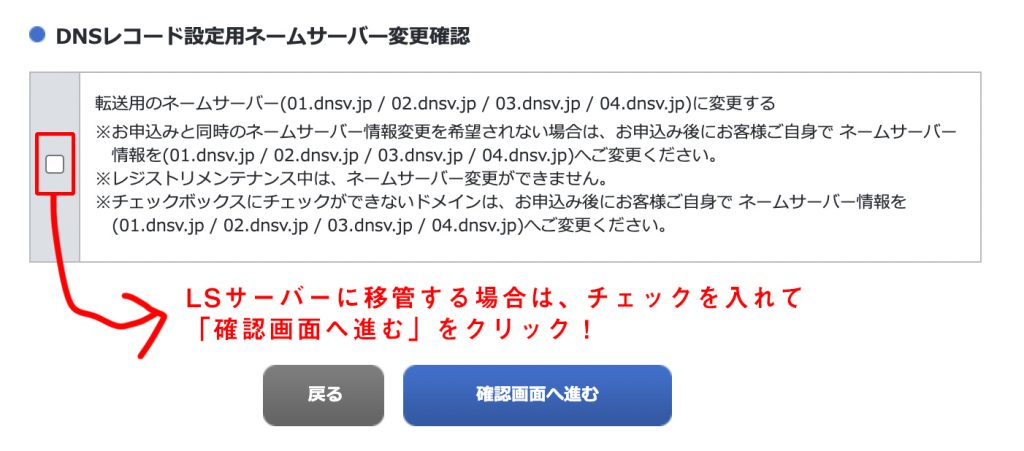 7. 「DNSレコード設定用ネームサーバー変更確認」にて、チェックボックスにチェックを入れて、確認画面へ進む。