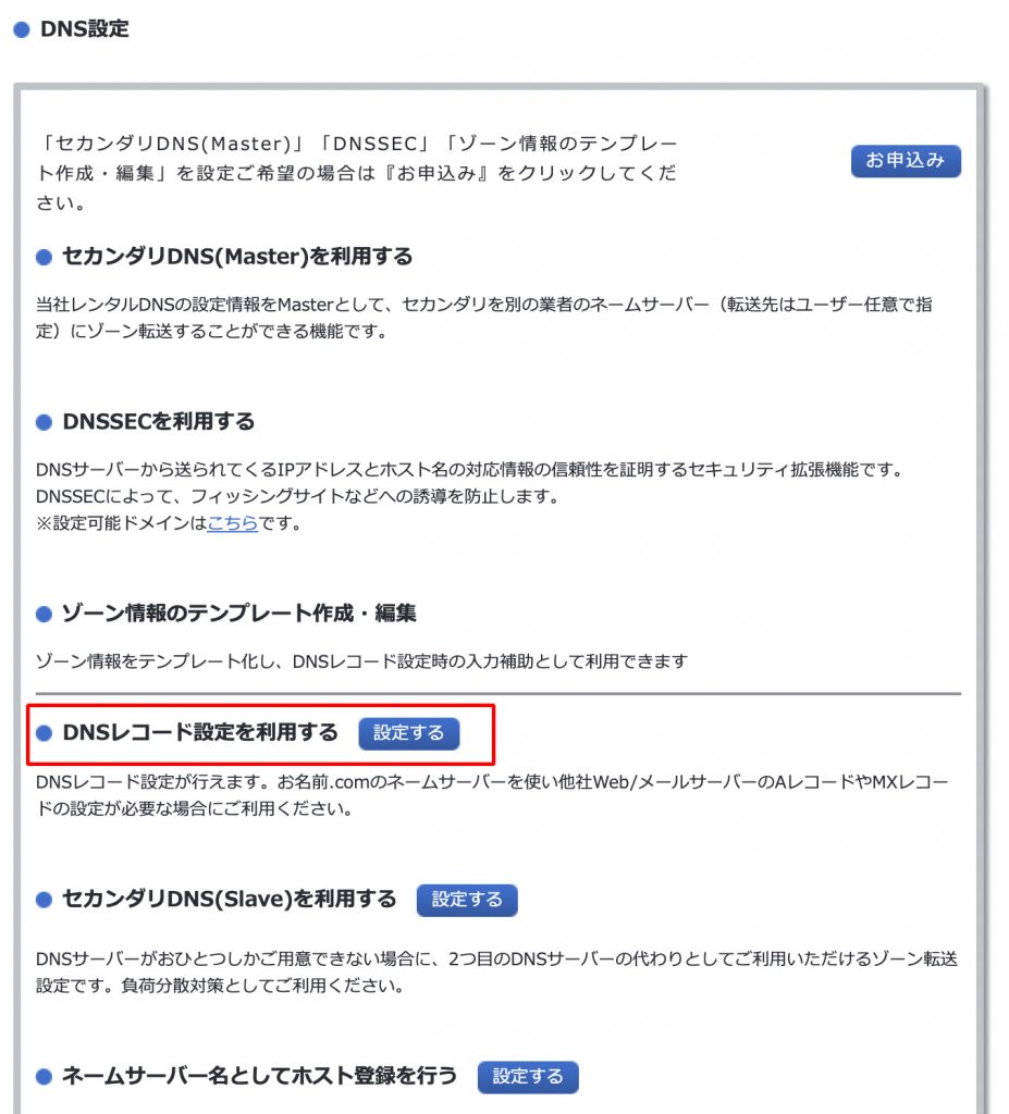 →上部メニューの「ネームサーバーの設定」の中にある「ドメインのDNS設定」をクリック。